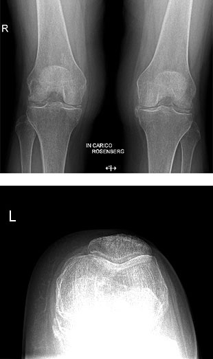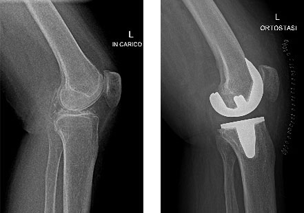 Paziente donna di 67 anni, affetta da gonartrosi tricompartimentale sinistra aggravata da calcificazione dei menischi, trattata con protesi totale mini invasiva del ginocchio a conservazione del legamento crociato posteriore.